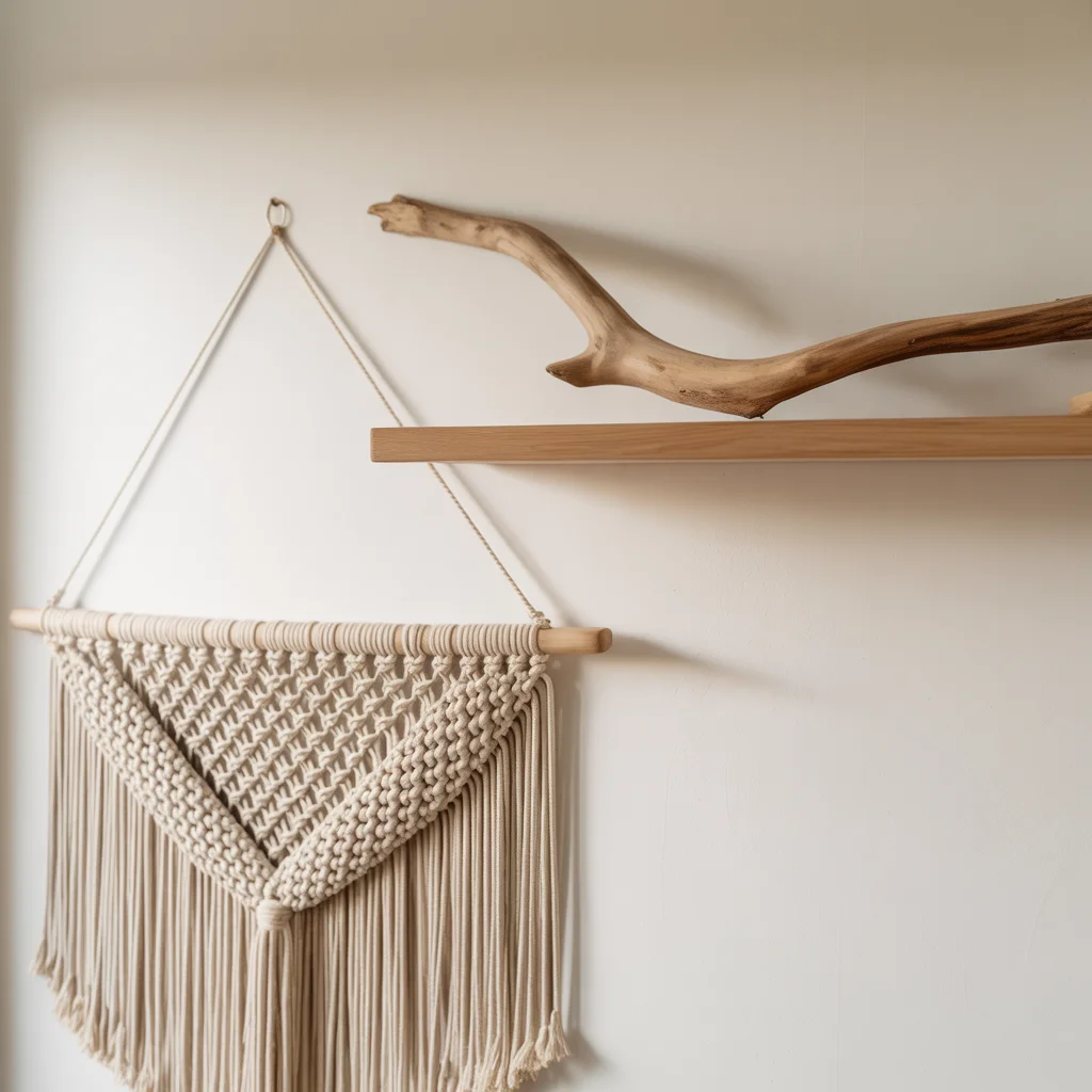 Forget matching wall art. Embrace balanced asymmetry. Hang a large, textured macramé piece off-center. Place a small, simple shelf higher up on the opposite side. Hold a single piece of driftwood or a crystal on it. The empty space between them is powerful.
