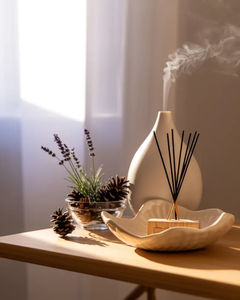Fragrance shapes your mood. Skip synthetic air fresheners. Create a small scent station instead. Use a beautiful ceramic dish for holding resin incense. Place a sleek diffuser for essential oils nearby.