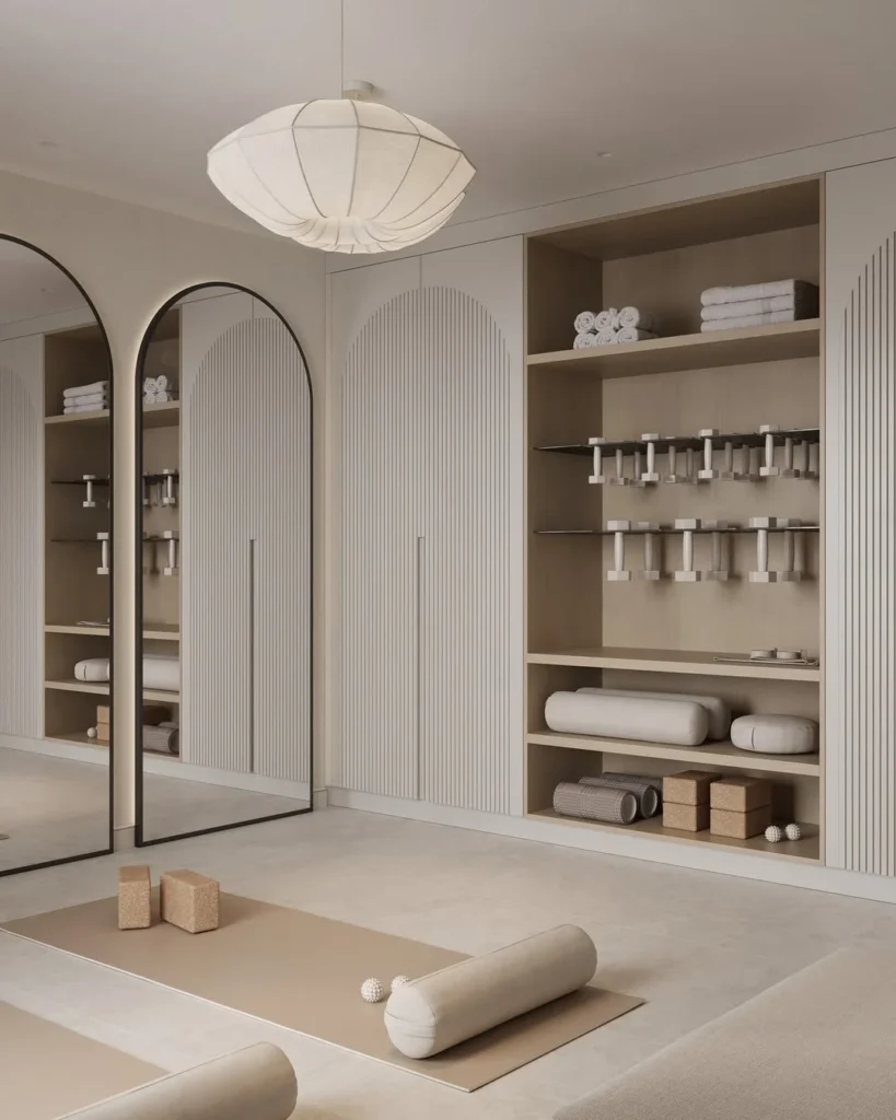 The well-organized shelves are stocked with neatly arranged towels, yoga props, and accessories, maintaining both function and style. Everything is within reach, contributing to the room’s peaceful efficiency.