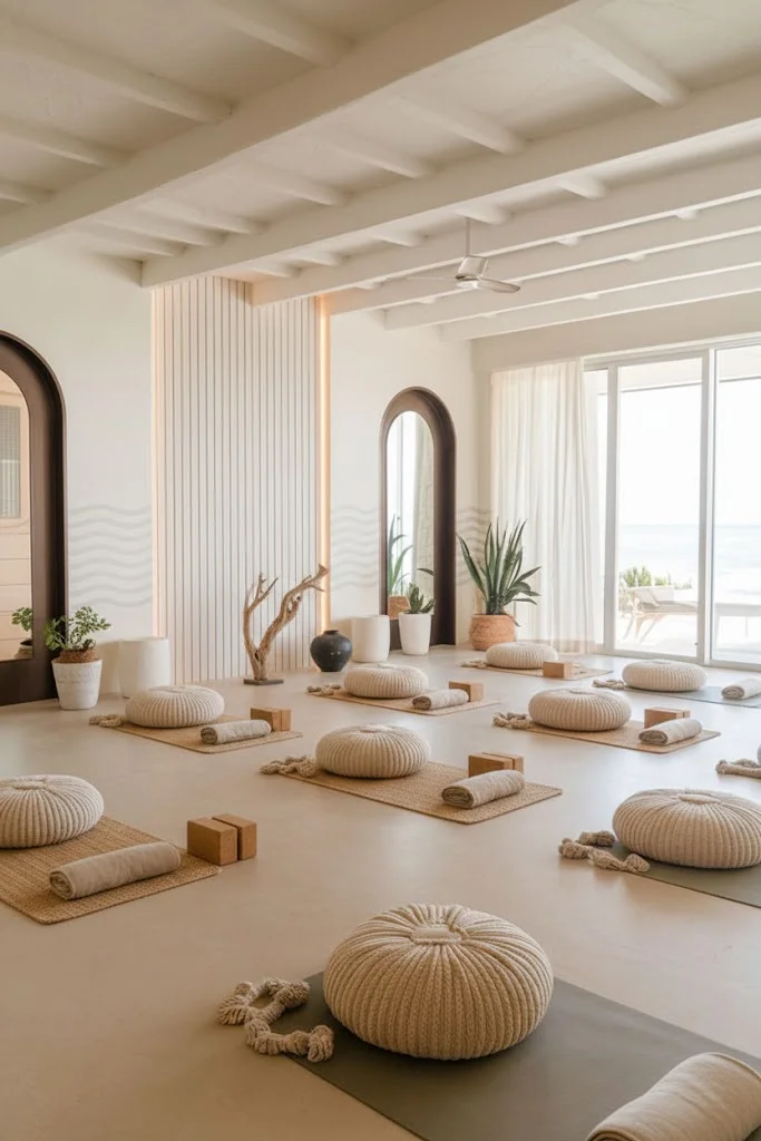 This light-filled yoga space features serene tones and a clean, minimalist design, perfect for mindful practice. The natural light flowing in through large windows offers a connection to the calming ocean view beyond.