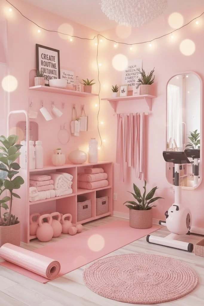 Soft blush pink walls and decor create a warm, inviting space for yoga and meditation. The gentle glow from string lights adds a cozy ambiance, setting the mood for relaxation.