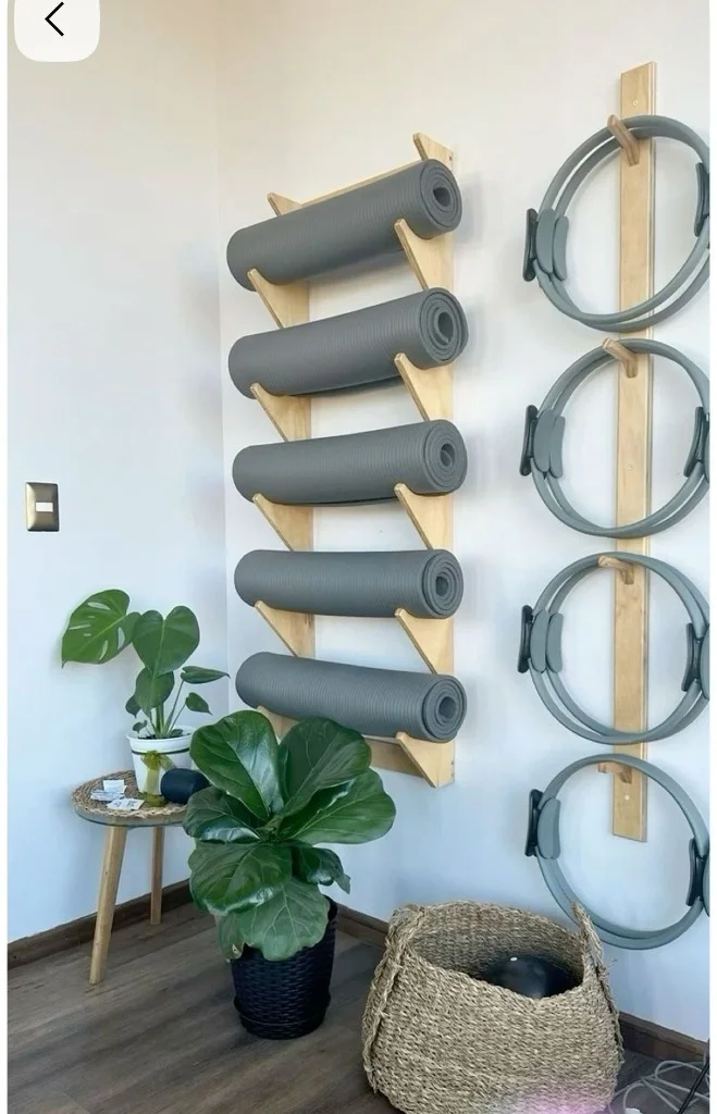 This minimalist setup neatly organizes yoga mats and accessories, offering a clean and functional storage solution. The wooden rack holds the rolled mats, keeping them easily accessible while maintaining a tidy look.