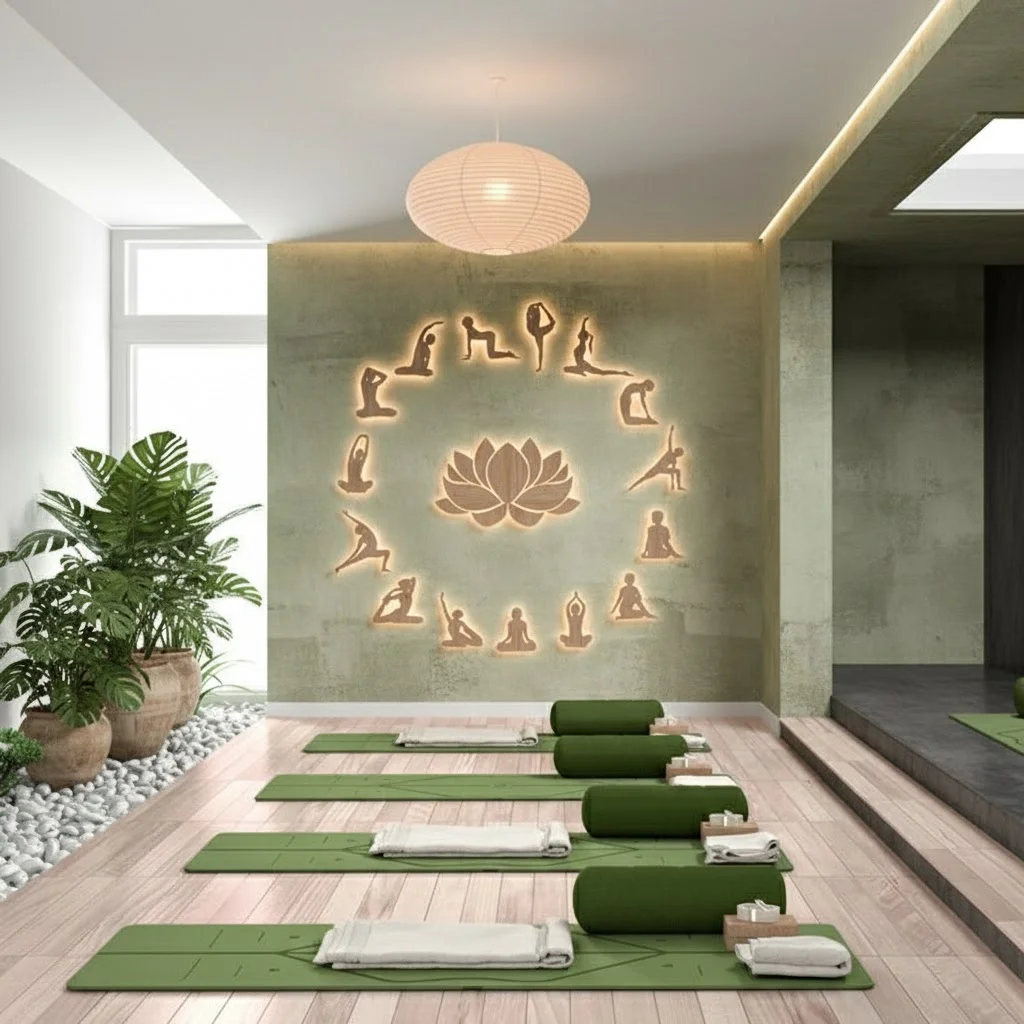 Each setup features thoughtfully arranged mats, props, and inspiring decor that enhances the overall ambiance. Simple, clean lines and neutral tones help bring peace to the mind and body during practice.