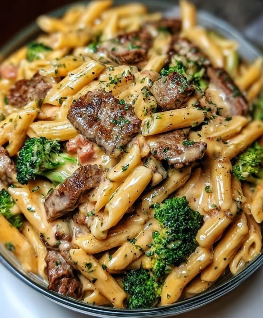 The pasta cooks in the same pan and absorbs the rich flavors from the steak and garlic sauce. As the sauce thickens, it coats the pasta and meat perfectly, creating a warm and comforting meal.