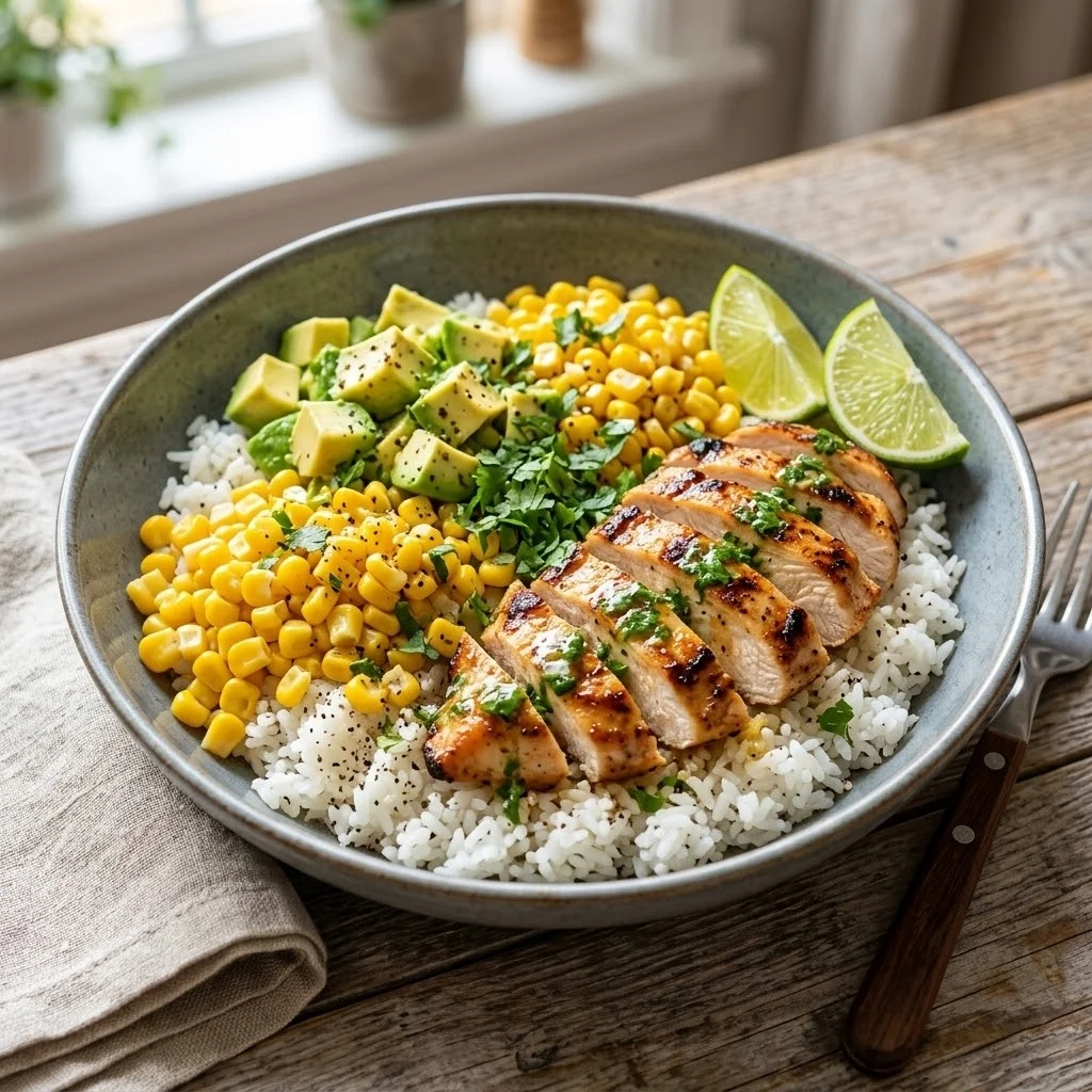 This chicken avocado rice bowl is fresh, colorful, and satisfying. It combines grilled chicken, fluffy rice, sweet corn, and creamy avocado in a single dish.