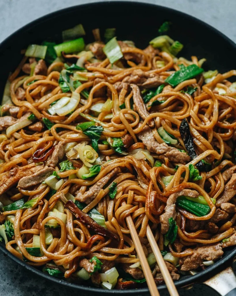 Garlic, soy sauce, and spices create a comforting base that coats the noodles beautifully. Fresh green onions add a mild crunch and brightness that balances the dish.