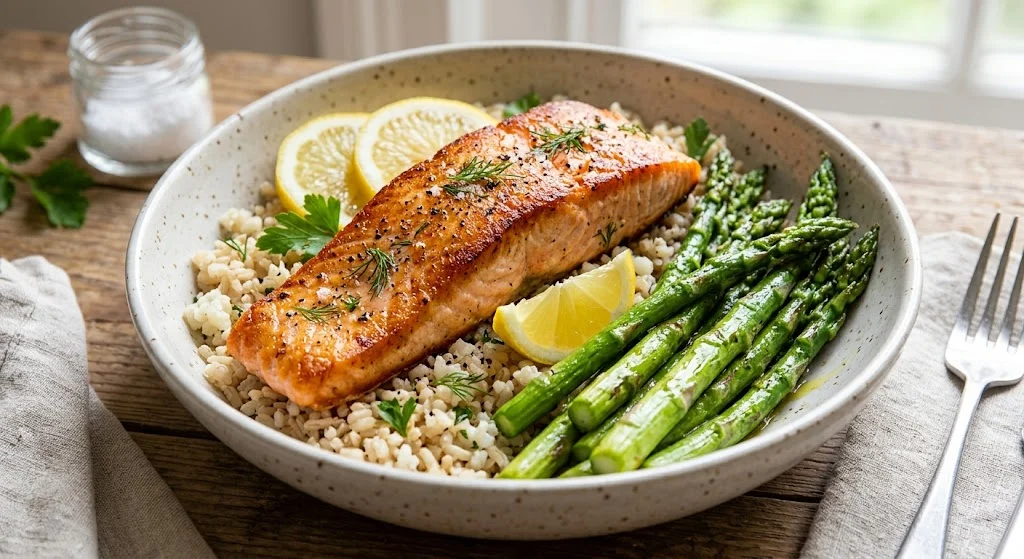 - Bake or pan‑sear salmon with salt, pepper, and herbs.