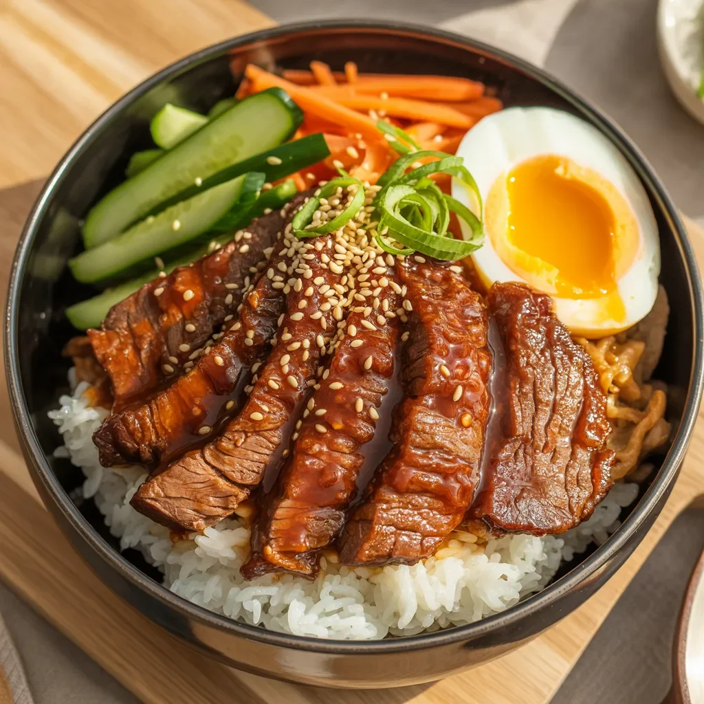 This spicy grilled beef rice bowl is a delightful combination of savory flavors and textures. Tender strips of grilled beef are placed on a bed of fluffy white rice, making a flavorful foundation. The dish is elevated with fresh toppings, including crisp cucumber slices, shredded carrots, and a perfectly soft-boiled egg with a rich, runny yolk. A sprinkle of sesame seeds and green onions adds crunch and a burst of freshness. Drizzled with a spicy sauce, this bowl is the ultimate satisfying meal, balancing spice, umami, and freshness in every bite.