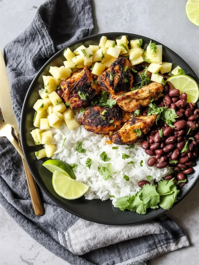 For a flavorful dinner option, this spicy grilled chicken rice bowl brings a perfect balance of heat and freshness. The seasoned chicken is grilled to perfection, with a crispy exterior and tender interior, topped with a spicy marinade. Served over a bed of fluffy white rice, this dish is accompanied by black beans, adding richness and protein. A tangy, refreshing pineapple garnish balances the heat, while a squeeze of lime and fresh cilantro adds zest. This bowl is vibrant, filling, and offers a delightful combination of spicy, savory, and sweet flavors. Perfect for anyone craving a healthy and flavorful dinner, packed with bold ingredients.