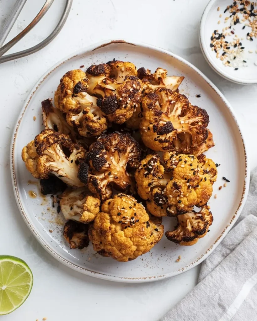 This spicy roasted cauliflower bowl offers a satisfying balance of heat and flavor with crispy, golden florets. Cauliflower is coated with a blend of spices, then roasted until caramelized and tender. Topped with sesame seeds and a squeeze of lime, this dish packs a punch with its smoky, spicy undertones. It’s served fresh and light, with the subtle tanginess of lime and earthy crunch from the seeds. This bowl is perfect for a light dinner, offering not only a healthy meal but also a flavor-packed experience. The vibrant presentation and bold flavors make this cauliflower bowl both a feast for the eyes and the palate.