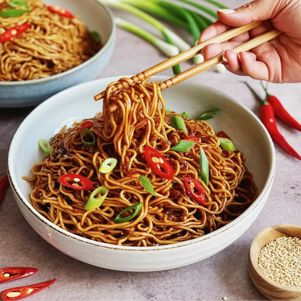 A delicious bowl of spicy sesame noodles is the perfect combination of bold flavors and satisfying textures. These noodles are coated in a savory, spicy sauce made from soy sauce, sesame oil, garlic, and chili paste. The heat from fresh red chilies and the crunch of green onions give the dish a delightful balance of spice and freshness. Topped with a sprinkle of sesame seeds, this dish is both flavorful and visually appealing. The chewy noodles make each bite a comforting experience, while the spice keeps things exciting. Serve it as a quick dinner for a flavorful meal that’s packed with all the right ingredients.