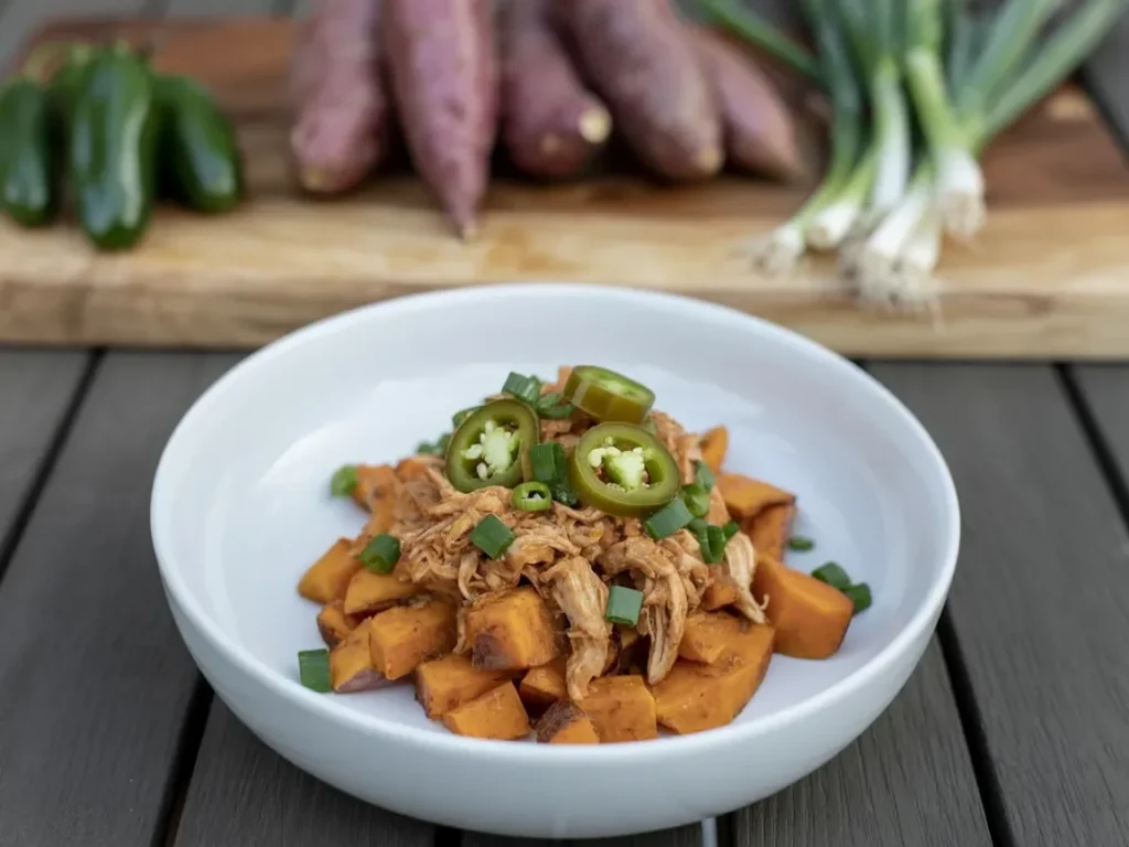 A spicy pulled chicken and sweet potato bowl offers a wonderful mix of flavors and textures. Tender shredded chicken is infused with a savory spice blend, making it a flavorful topping for roasted sweet potato cubes. The addition of fresh jalapeños and green onions adds a burst of heat and freshness to the dish. This vibrant bowl is not only satisfying but also packs a nutritious punch with the sweet potatoes providing fiber and antioxidants. Served with a tangy kick from the jalapeños and the richness of the pulled chicken, this bowl is a must-try for those craving a spicy, healthy meal.