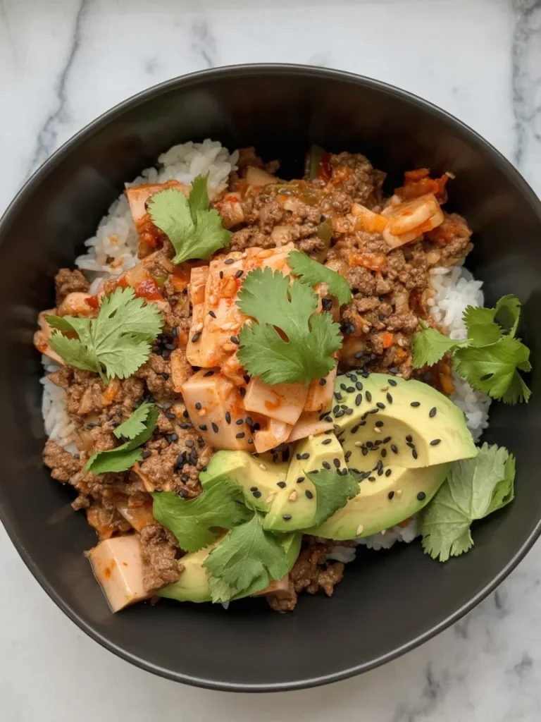 This flavorful bowl combines savory, spicy, and refreshing elements in every bite. Ground beef is cooked with savory spices and paired with the bold, tangy flavors of kimchi for that perfect balance of heat and umami. Served over a bed of fluffy rice, this dish is topped with creamy avocado slices, fresh cilantro, and a sprinkle of sesame seeds for texture. The richness of the beef and the spiciness of the kimchi complement each other beautifully, making this bowl both comforting and packed with flavor. Whether you’re looking for a quick weeknight dinner or a satisfying meal, this spicy kimchi beef bowl hits all the right notes.