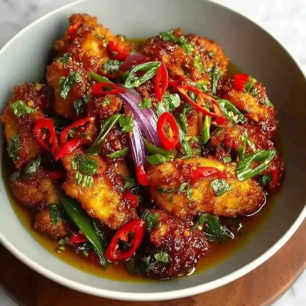 This vibrant bowl features crispy chicken coated in a rich, spicy sauce that is full of flavor. Garnished with freshly sliced red chilies and green onions, the dish packs a punch of heat while balancing the savory crispy chicken with bright, aromatic herbs. A generous sprinkle of cilantro and a drizzle of tangy sauce add a burst of freshness to each bite. The tender chicken combined with the bold, spicy sauce and crunchy garnishes makes this bowl a perfect meal for those who love a satisfying dish with a spicy kick. Serve over fluffy rice or noodles to soak up all the delicious sauce.