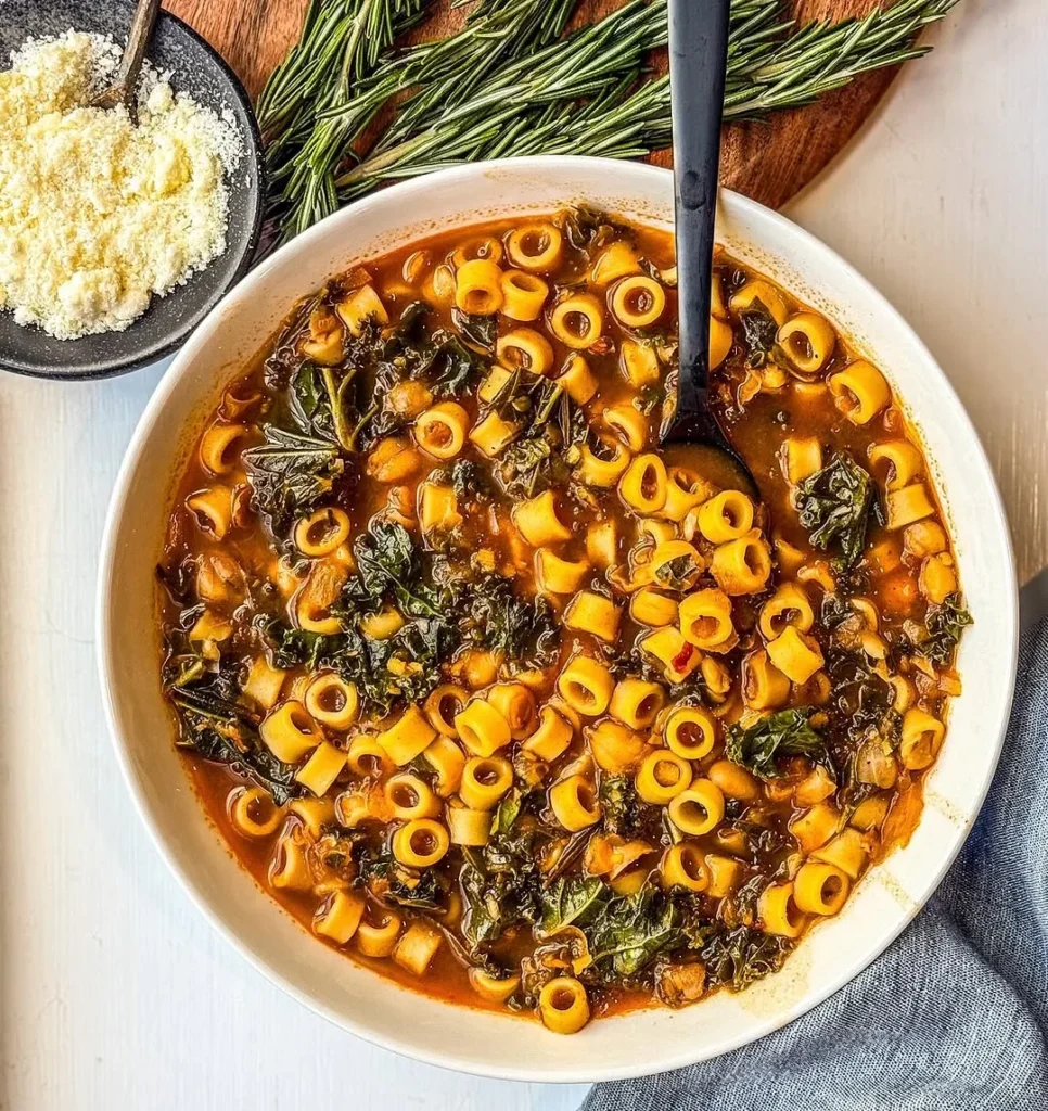A comforting bowl of spicy kale and pasta with a rich, savory broth. The kale brings a hearty texture, while the pasta adds a satisfying bite. The sauce is infused with layers of flavor, bringing together spices, herbs, and a savory depth that enriches every spoonful. Perfectly cooked pasta soaks up the broth, and the greens balance the heat from the spices, making each bite flavorful and filling. A generous sprinkle of freshly grated parmesan adds a finishing touch of creaminess and sharpness. This bowl combines warmth and spice, perfect for a cozy dinner.