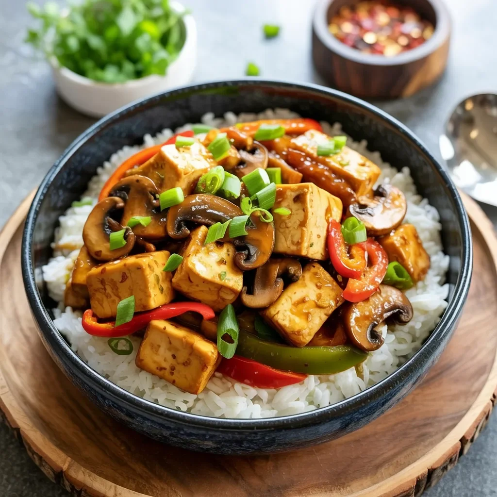This spicy tofu and veggie rice bowl offers a delightful balance of savory flavors and heat. Crispy tofu cubes are sautéed with colorful bell peppers, mushrooms, and a savory sauce, making each bite satisfying and flavorful. The dish is served over a bed of tender jasmine rice, providing a perfect base to absorb the sauce’s rich flavors. Topped with fresh green onions and a sprinkle of chili flakes, this bowl has the right amount of spice to elevate the taste. It’s a great plant-based option that packs a punch with every bite.