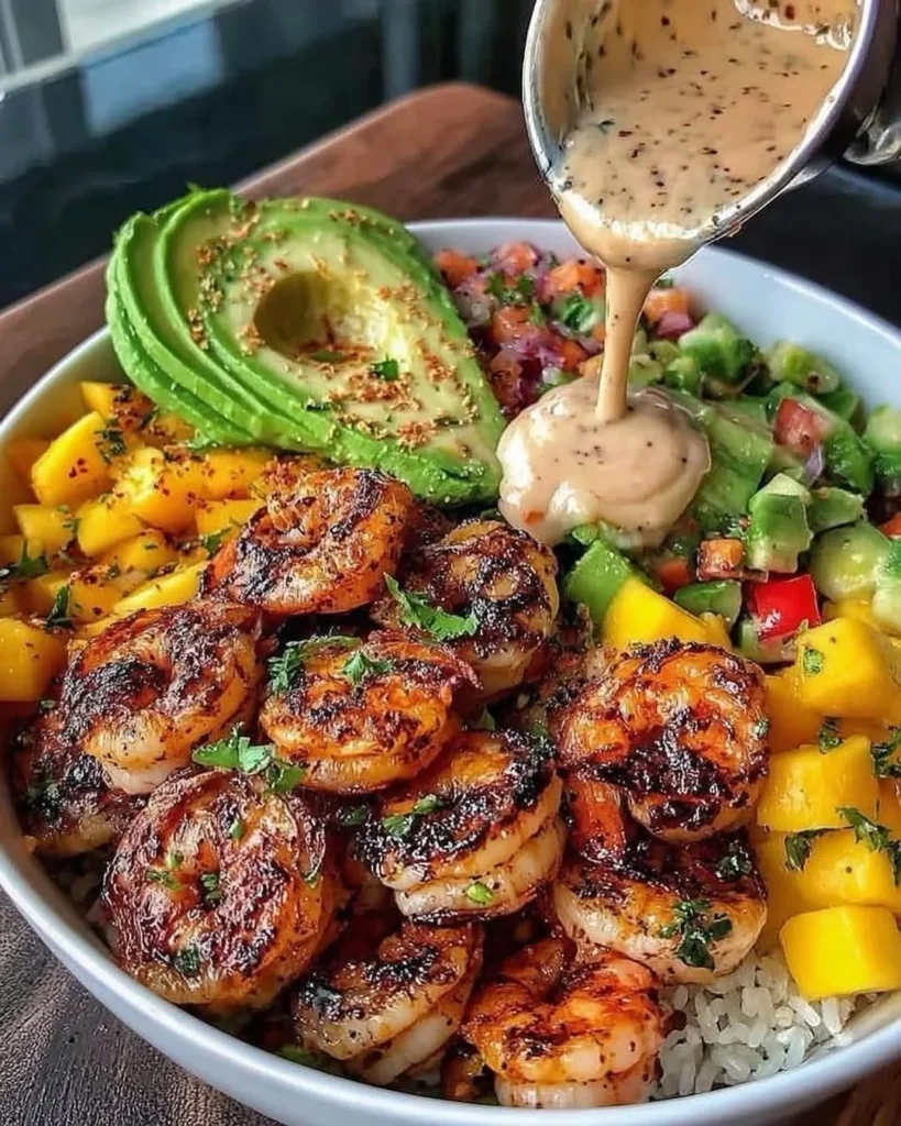 This spicy shrimp rice bowl is a vibrant and flavorful dish that brings together bold ingredients for a delicious dinner. The juicy shrimp are seasoned with spices and grilled to perfection, offering a smoky, savory flavor. Alongside the shrimp, fresh mango chunks and creamy avocado balance the heat, adding sweetness and richness. Topped with a tangy, creamy dressing, this bowl is packed with contrasting flavors and textures. A sprinkling of cilantro ties everything together while a side of pico de gallo adds freshness. Served over a bed of steamed rice, this dish is a feast for the eyes and the taste buds.
