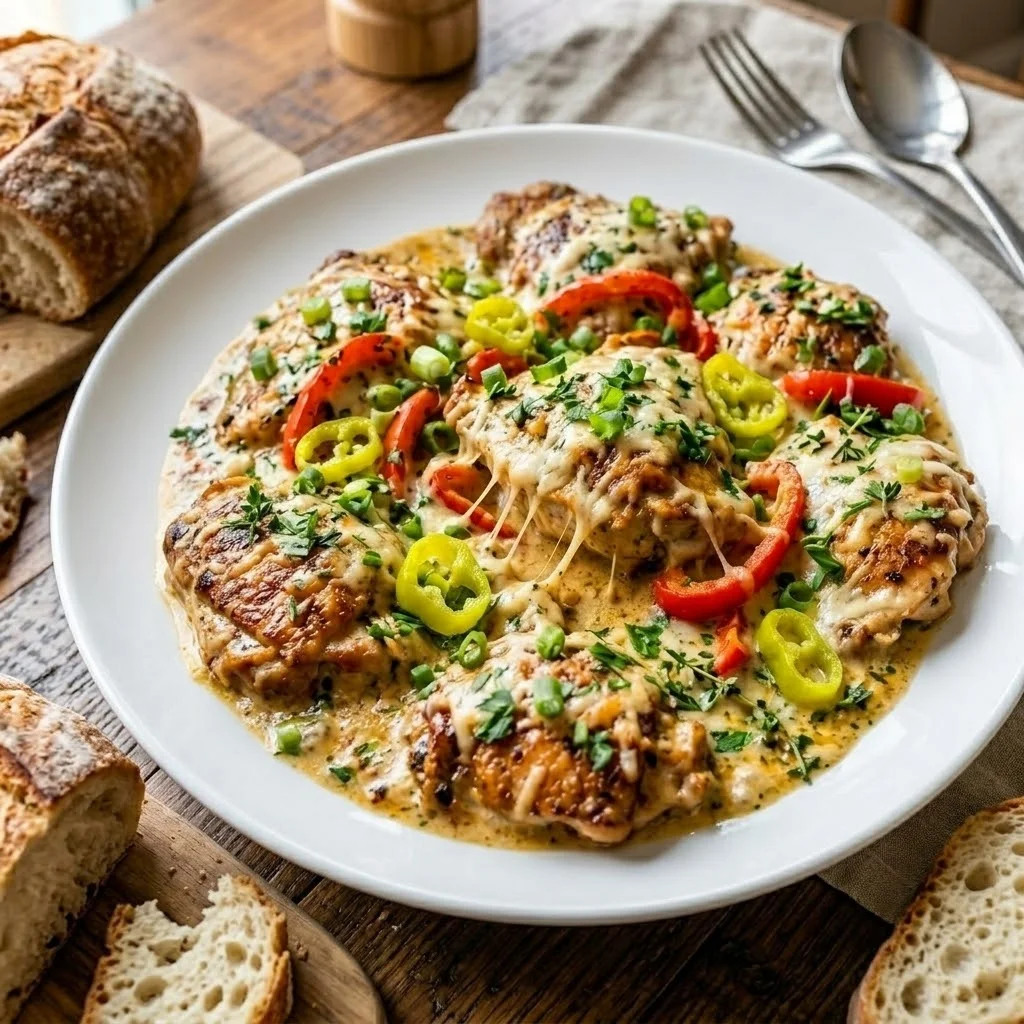 This Creamy Pepperoncini Chicken Skillet is the perfect balance of savory and creamy, with a touch of heat from the pepperoncini peppers that elevate the flavors. The chicken is seared to golden perfection and cooked in a luscious cream sauce that’s packed with flavor. Topped with fresh herbs, melted cheese, and vibrant peppers, this dish is the ideal weeknight meal that’s both satisfying and comforting.