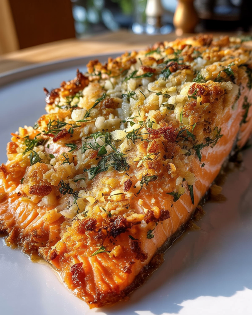 Leftovers can be stored in an airtight container in the fridge for up to 3 days. To preserve the crispy crust, reheat the salmon in the oven at 350°F (175°C) for a few minutes. Alternatively, you can use an air fryer to re-crisp the topping, making it as crunchy as fresh out of the oven. Avoid microwaving, as it will soften the crust.