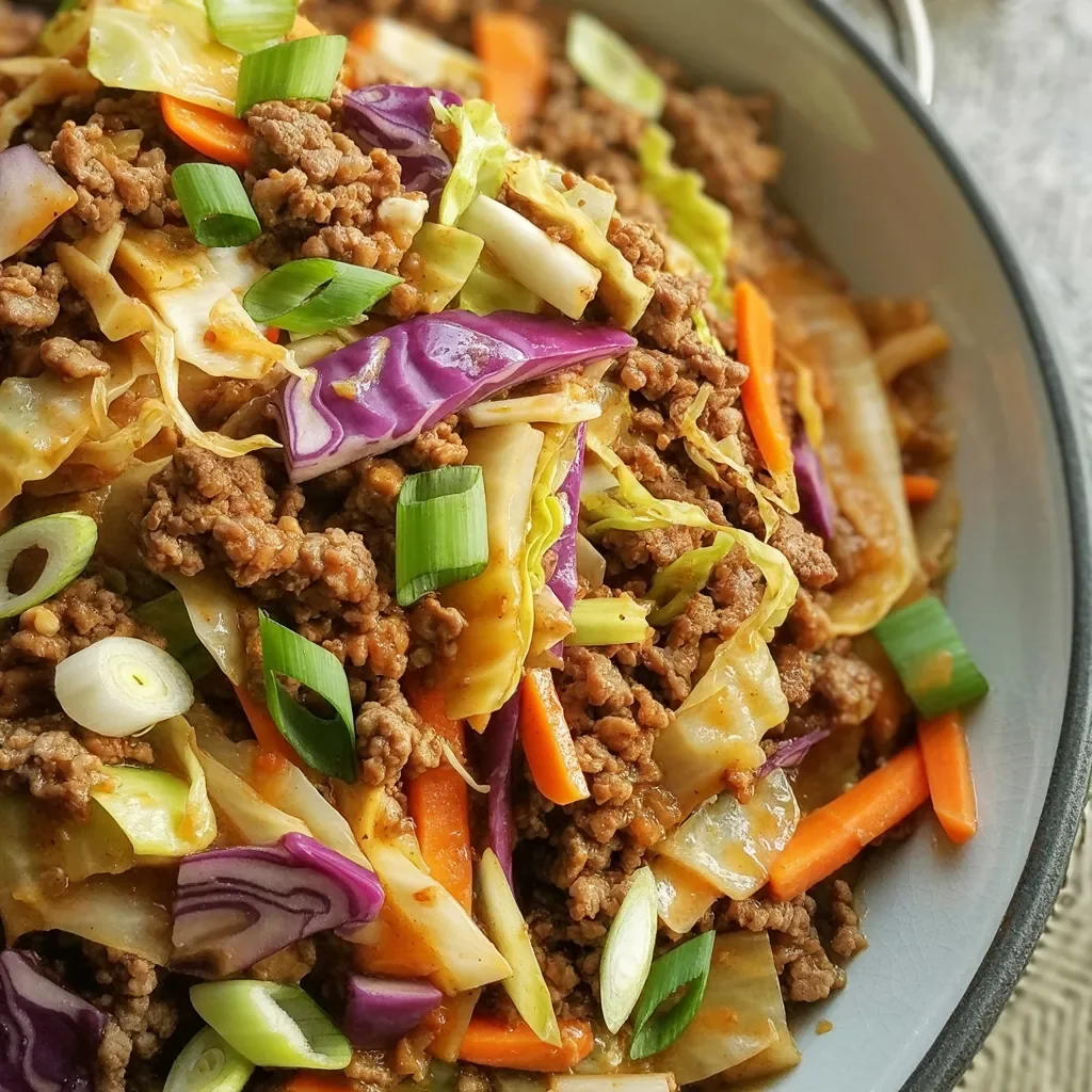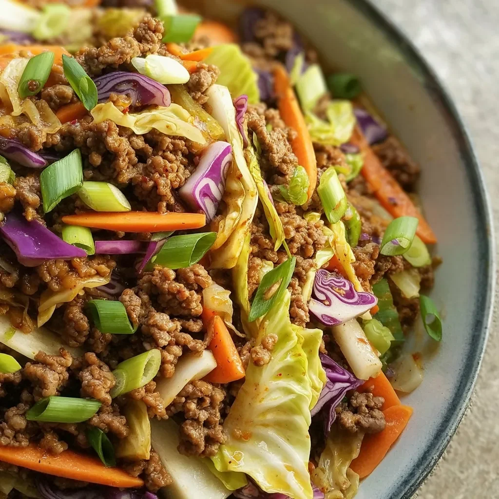 Egg roll in a bowl is basically a deconstructed egg roll. Instead of wrapping the filling in a wrapper and frying it, you cook the filling ingredients together in a skillet and serve it in a bowl. You still get the signature flavor profile: ground meat, cabbage, carrots, garlic, ginger, soy sauce, and a little sesame vibe.