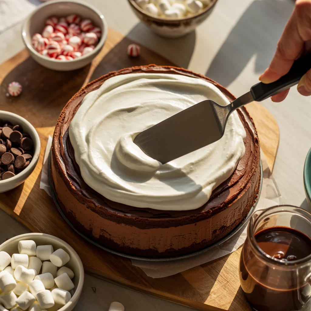 Before serving, spread whipped cream over the top and garnish with marshmallows, chocolate chips, and optional peppermint pieces for a festive touch.