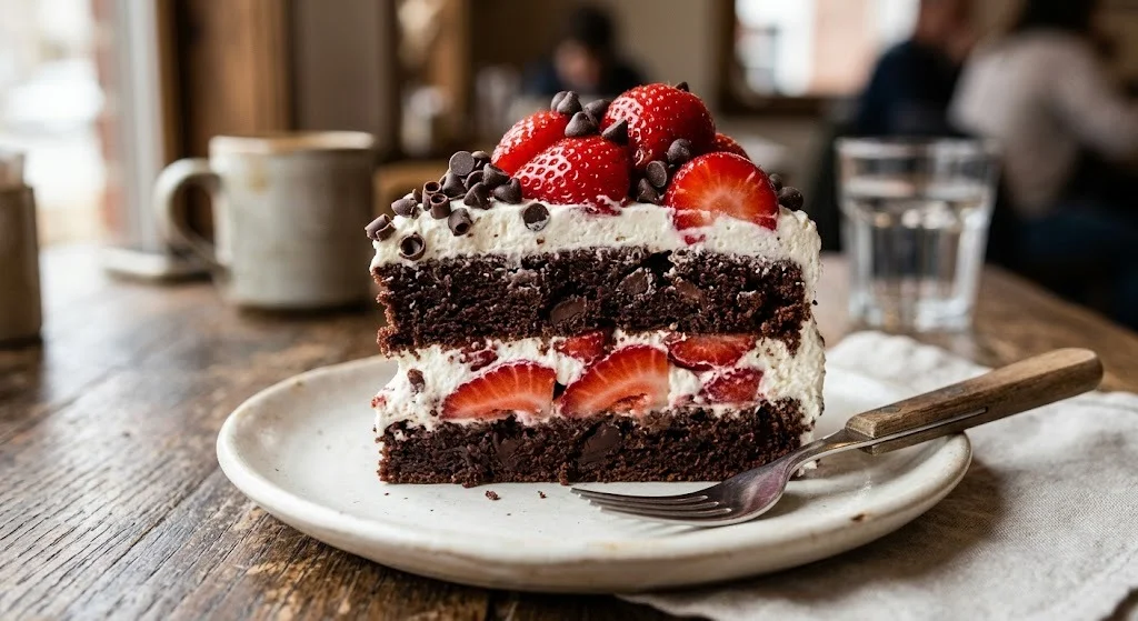 It’s a visual and sensory treat: the dark, moist chocolate cake perfectly complements the sweet strawberries, and the fluffy whipped cream adds just the right amount of lightness. The crunch of chocolate chips scattered across the top gives it the finishing touch, making every bite a delightful experience.