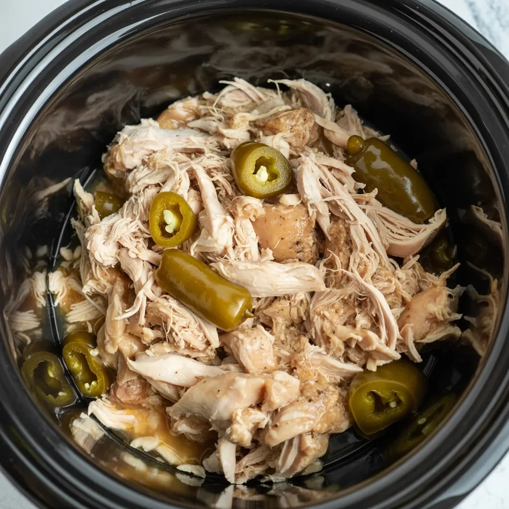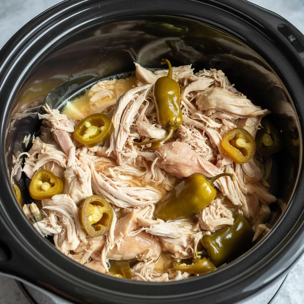 Once the chicken is done, use two forks to shred it directly in the slow cooker, mixing the chicken with the sauce and the melted butter. The chicken will absorb all the flavors from the seasoning and pepperoncini peppers, making it incredibly flavorful.