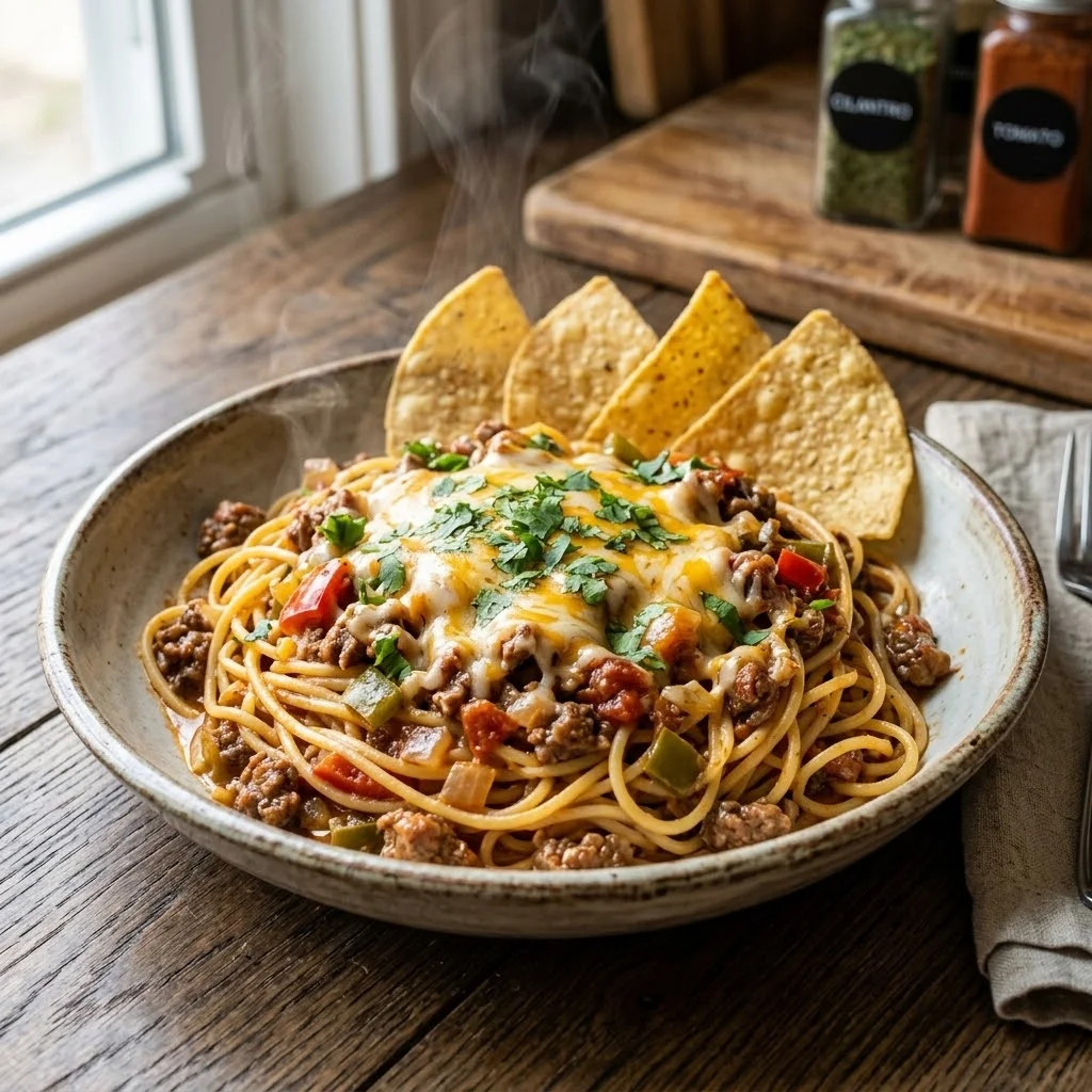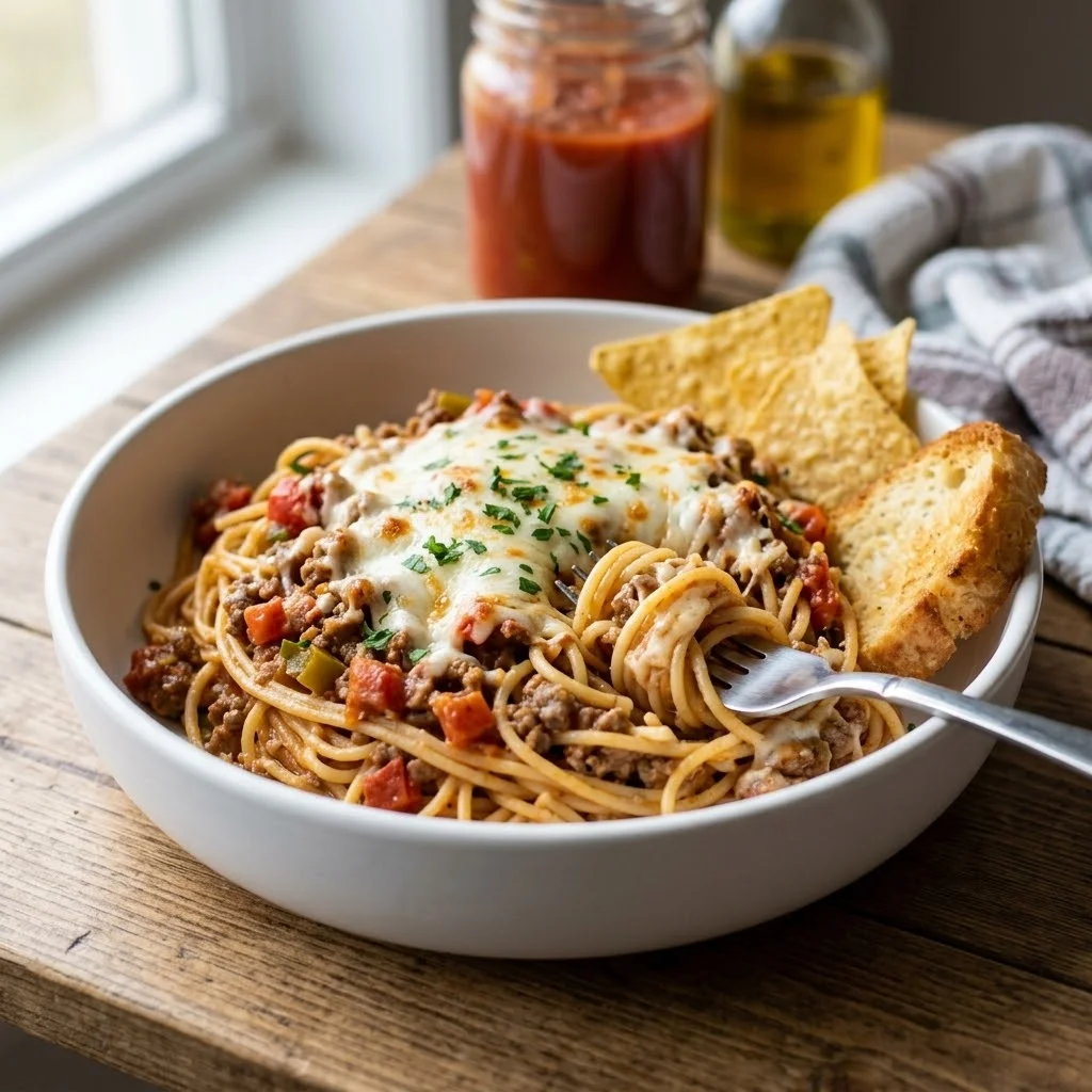 Serve the cheesy beef spaghetti in a bowl with crispy tortilla chips or toasted bread on the side for extra crunch and texture.