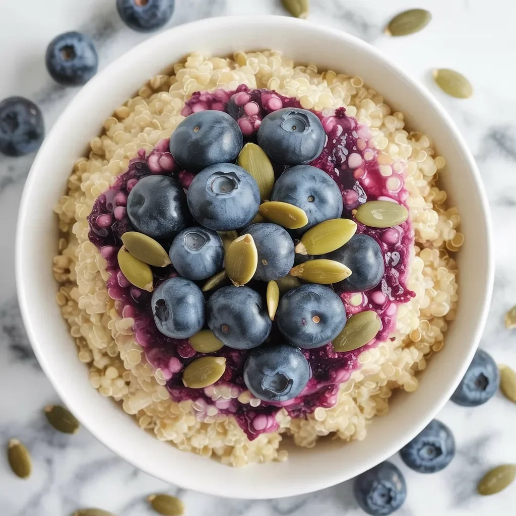 Transfer the warm quinoa into a serving bowl. Top it with fresh blueberries, seeds, and a spoonful of yogurt for added creaminess.