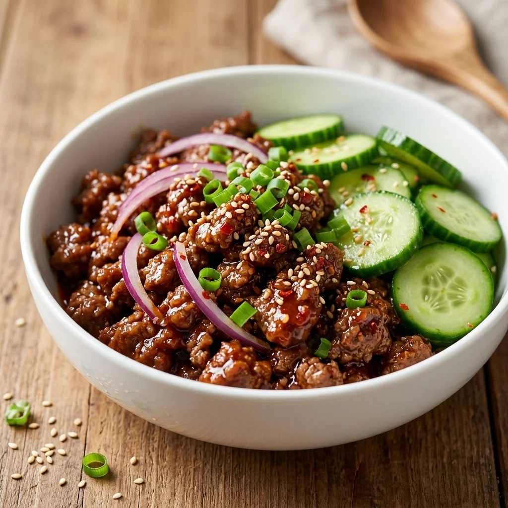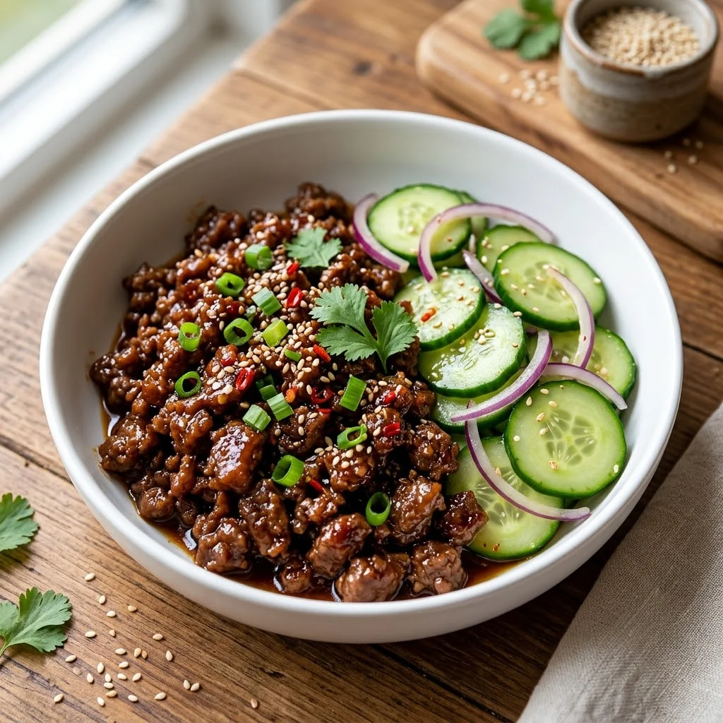 Juicy ground beef cooked in a rich Korean-inspired sauce pairs perfectly with a refreshing, crunchy cucumber salad that balances the heat and richness. The best part? You can make this entire meal in under 20 minutes using simple ingredients.