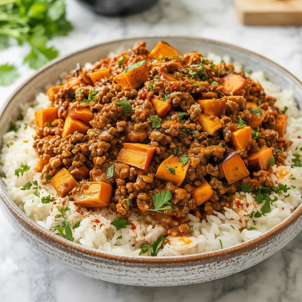 The sweetness of roasted sweet potatoes balances the savory ground beef while fluffy rice adds warmth and texture. Fresh herbs brighten the whole dish.