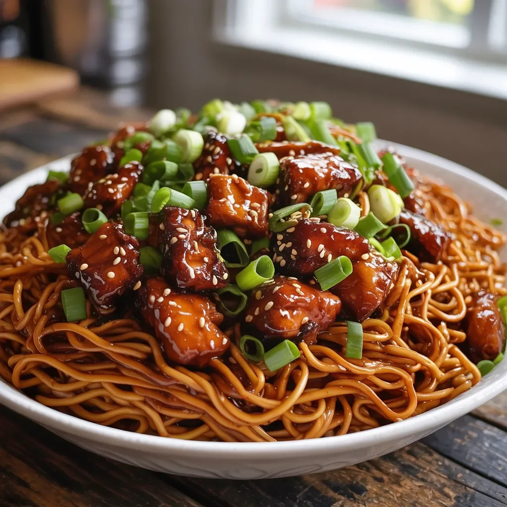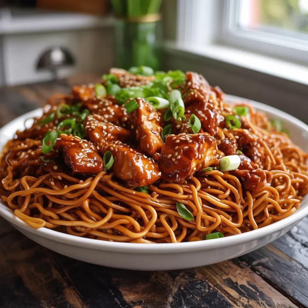 The noodles are coated in a rich savory sauce, topped with juicy chicken pieces, and finished with fresh green onions and sesame seeds for a delicious balance of flavor and texture. The best part is that this dish comes together quickly with simple ingredients you probably already have in your kitchen.
