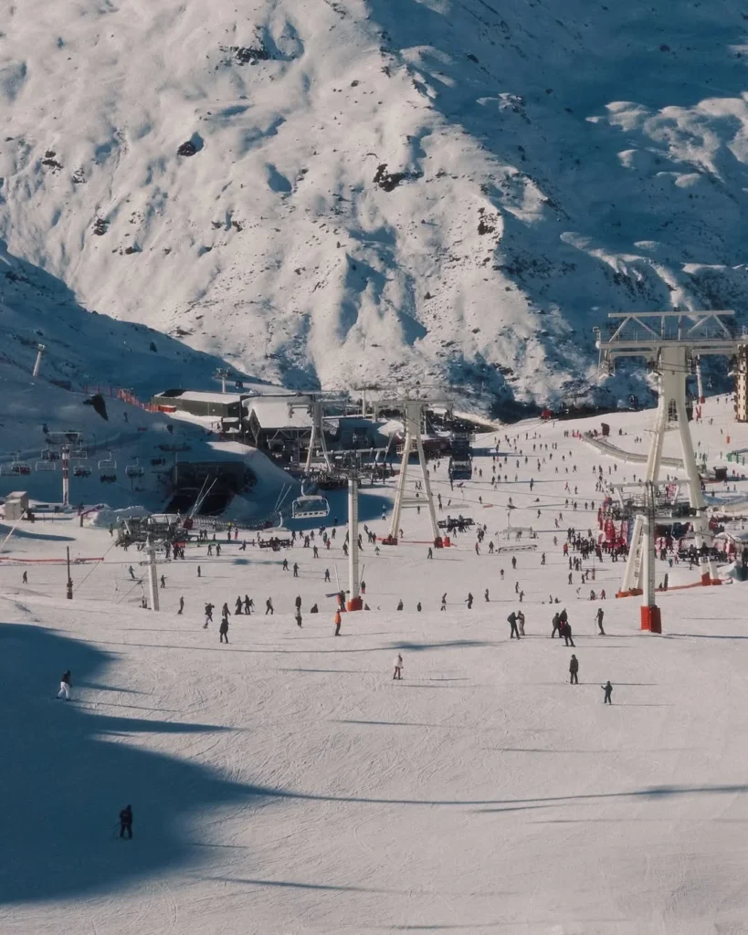 A wide expanse of snow stretches across the mountain base, dotted with skiers and snowboarders tracing their way down the slopes. The crisp winter light casts long blue shadows, creating a stunning contrast against the white terrain. Every movement feels alive, a blend of energy, excitement, and the quiet rhythm of nature.