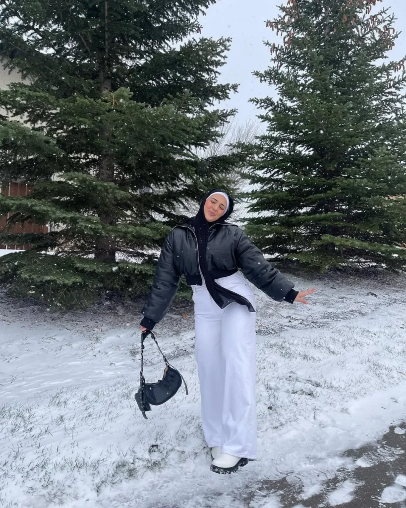 Fresh snowflakes fall softly as she poses with effortless joy among the pine trees, her smile glowing brighter than the winter light. The contrast of her sleek black puffer jacket and wide-leg white trousers creates a striking monochrome look that blends elegance with modern comfort.