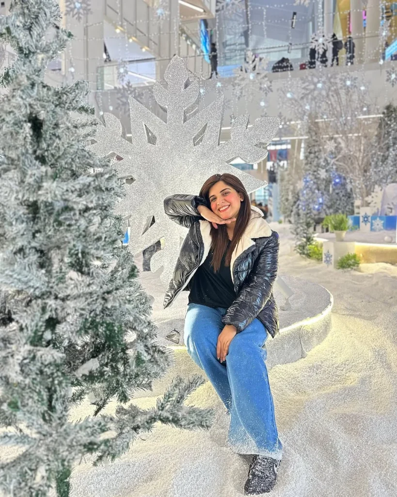 Her outfit blends comfort with a touch of modern chic, perfectly suited for an indoor winter-themed shoot. The blue denim and black boots ground the look while keeping it effortlessly stylish.