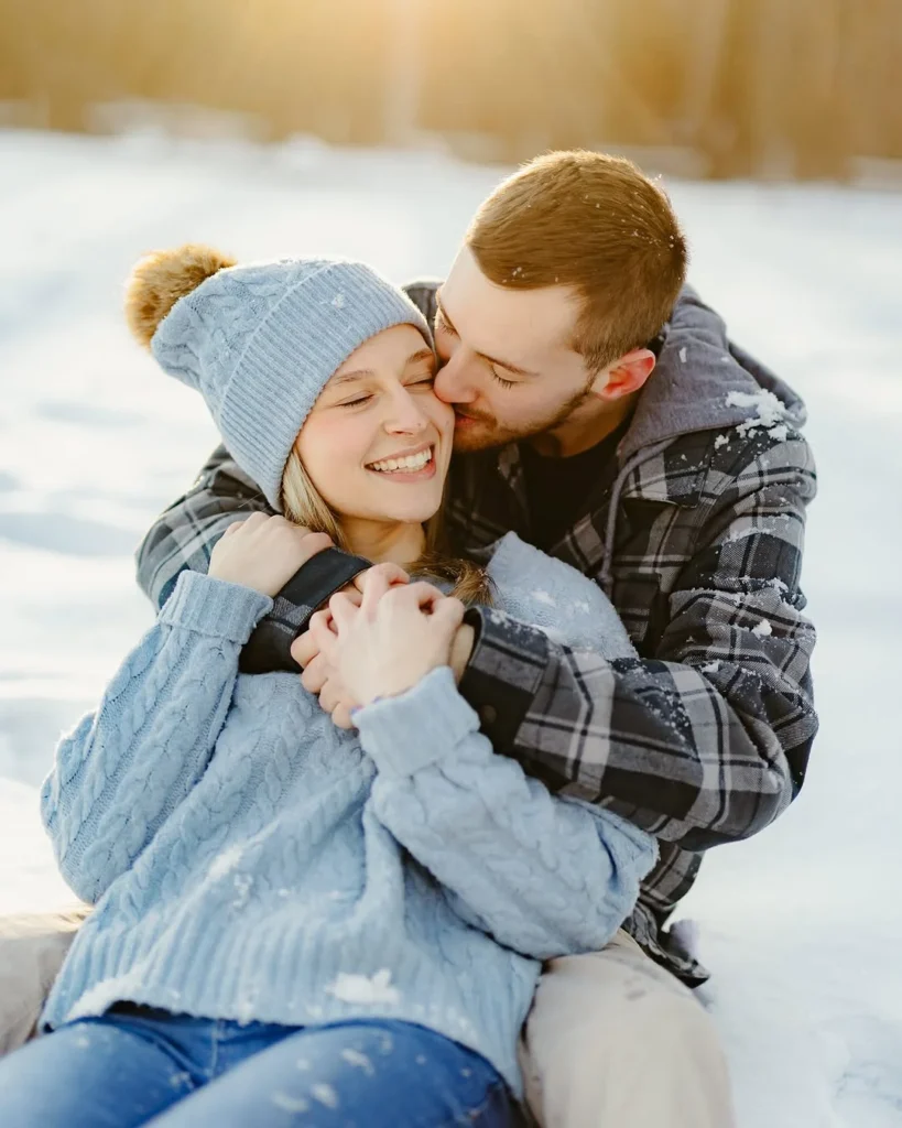 Soft sunlight filters through the trees, casting a golden glow over this heartwarming winter scene. The couple’s laughter fills the air as snowflakes cling gently to their sweaters, creating a moment that feels both tender and alive. Their closeness radiates warmth against the crisp chill of the snow-covered ground.