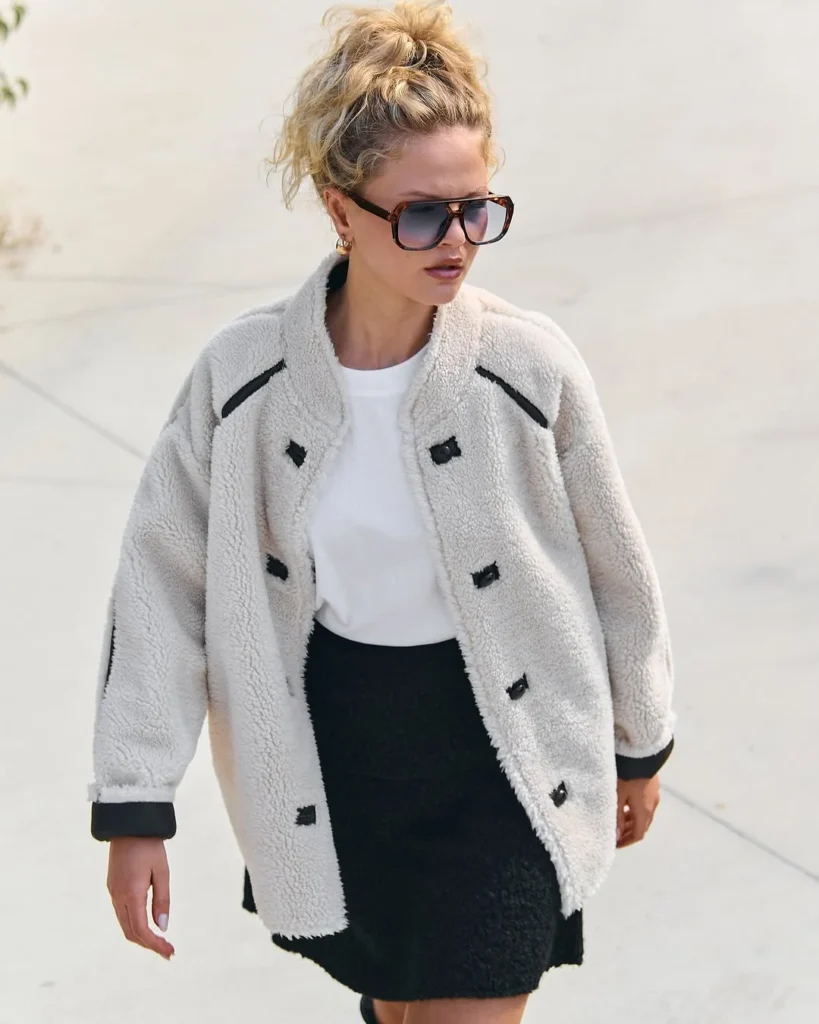 Soft winter sunlight highlights her effortless confidence as she walks with poise through the quiet streets. The textured sherpa jacket adds warmth and style, creating the perfect contrast with her sleek black skirt and crisp white tee. Every detail, from her tortoiseshell sunglasses to the rolled cuffs, speaks of casual sophistication.