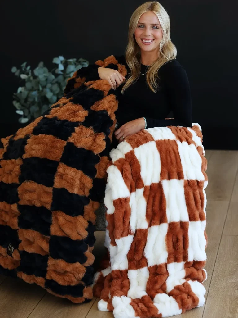 Warmth meets style in this cozy winter moment. The soft, plush blankets draped over the woman’s lap bring comfort and charm to the scene. Their rich checkered patterns, one in earthy brown and black, the other in burnt orange and white, add visual rhythm, making the textures almost tangible through the frame.