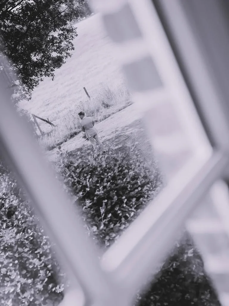 Framed by a softly blurred window, the scene unfolds like a quiet memory. A figure stands outside, surrounded by pale winter light and muted tones, their silhouette carrying a sense of stillness. The windowpane adds a poetic layer, as if the viewer is catching a fleeting moment of reflection, distance, and emotion.