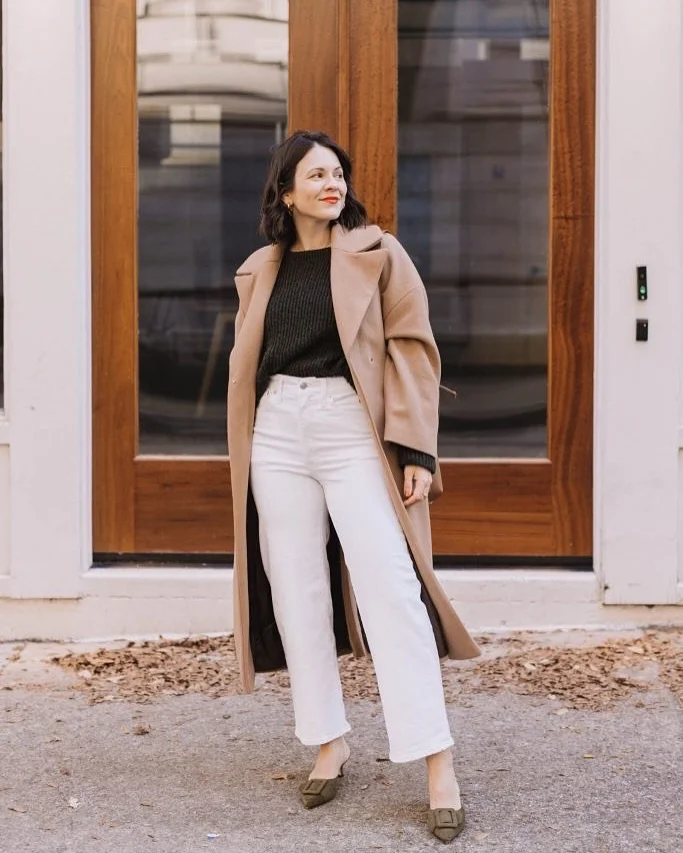 Soft sunlight reflects off city windows as she walks with quiet confidence, embodying the effortless charm of winter style. Her camel coat drapes gracefully over a dark sweater and crisp white jeans, creating a clean and modern contrast. The muted tones blend seamlessly with the urban backdrop, adding warmth and sophistication to the look.
