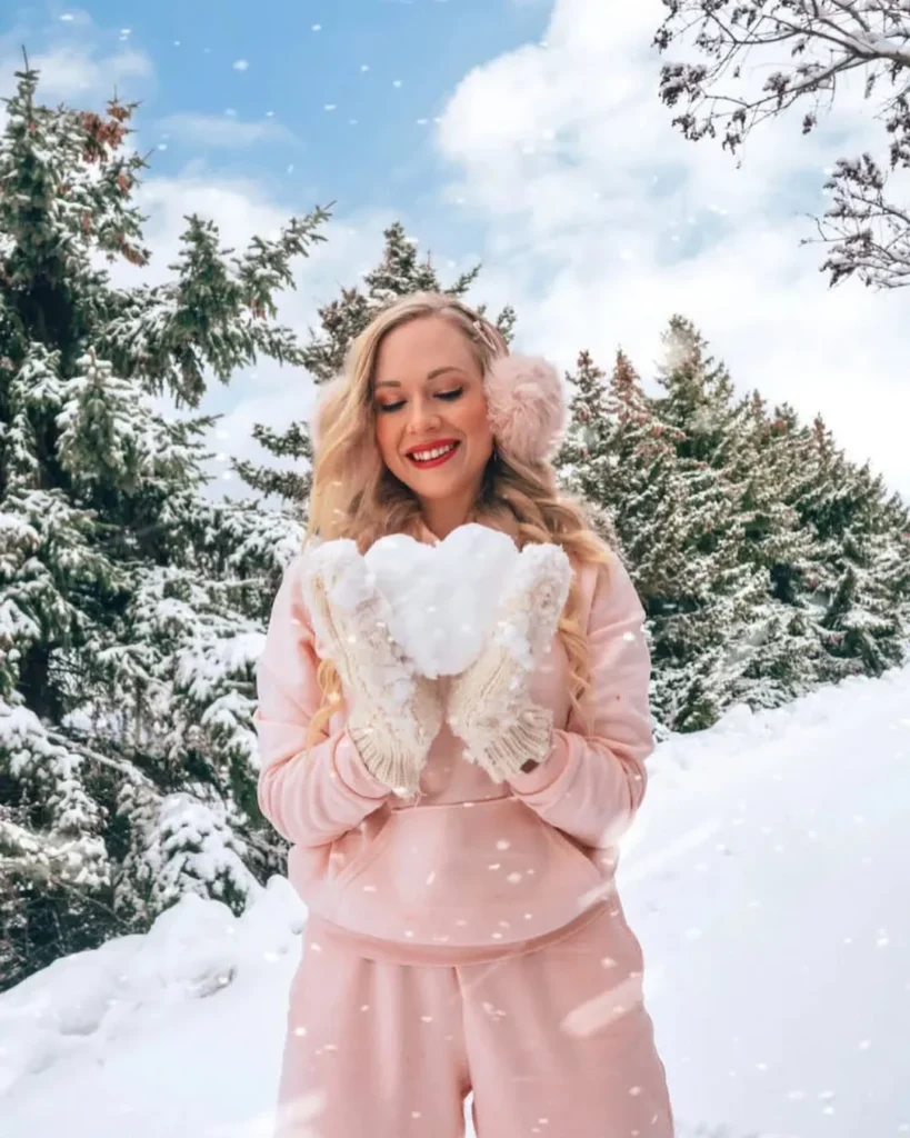 Surrounded by pine trees dusted with snow, the setting feels like a fairytale frozen in time. Her red lipstick brings a vibrant touch, balancing the pastel tones of her cozy look. Every detail, from the fluffy mittens to the delicate snowflakes, tells a story of pure winter delight.