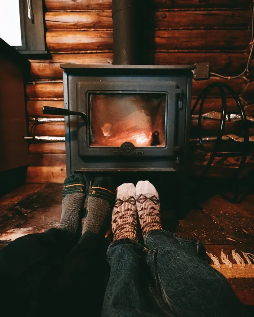 Soft crackles from the wood-burning stove fill the quiet cabin as two pairs of feet stretch toward its warm glow. The gentle flicker of firelight paints the wooden walls in hues of amber and gold, wrapping the space in calm and comfort. Thick socks and worn jeans tell a story of rest after a cold day outdoors.
