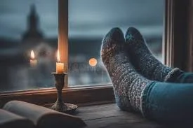 Soft candlelight flickers beside the window, casting a golden glow against the cool winter dusk. Wrapped in cozy wool socks, someone rests their feet on the sill, savoring a quiet moment of peace. Outside, the faint outline of a distant building fades into the blue-gray evening, creating a tranquil contrast between warmth and cold.