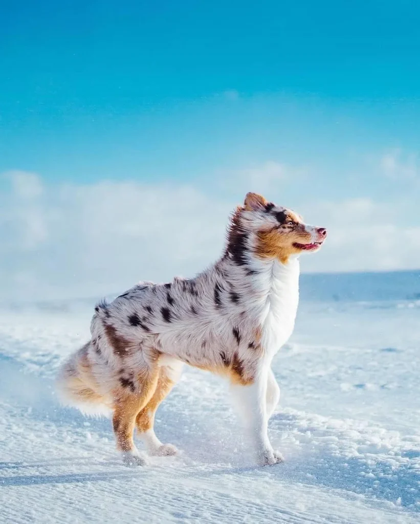 With each step, snow swirls beneath its paws, creating tiny clouds of frost. The bright blue sky stretches endlessly above, framing the moment in calm simplicity. There’s something contagious about the dog’s excitement, the kind of happiness that only comes from being outdoors in nature’s raw beauty.