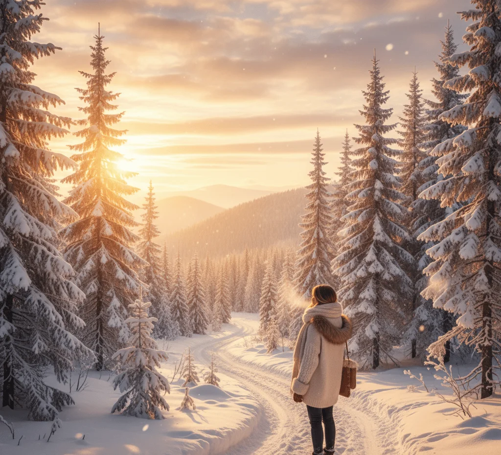 The soft glow of the evening sun spills across the snowy trail, casting a golden light over the forest. Each tree glistens under its frosted coat, creating a scene that feels calm and alive at the same time. The woman stands quietly, wrapped in a thick coat and scarf, watching the sun melt into the horizon, her breath forming small clouds in the crisp air.