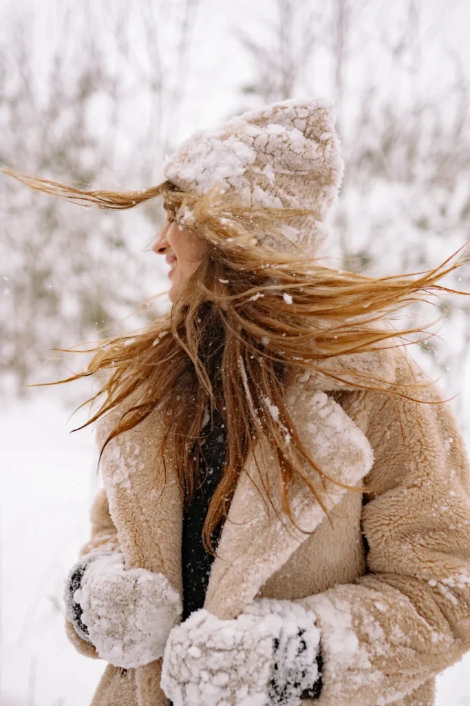 Wind catches her hair as laughter escapes into the cold air, creating a spontaneous winter moment. Snowflakes cling to her hat and coat, blending softly with the natural tones of her outfit. The motion of her hair against the white backdrop brings energy to the still winter scene, turning the chill into something alive and joyful.
