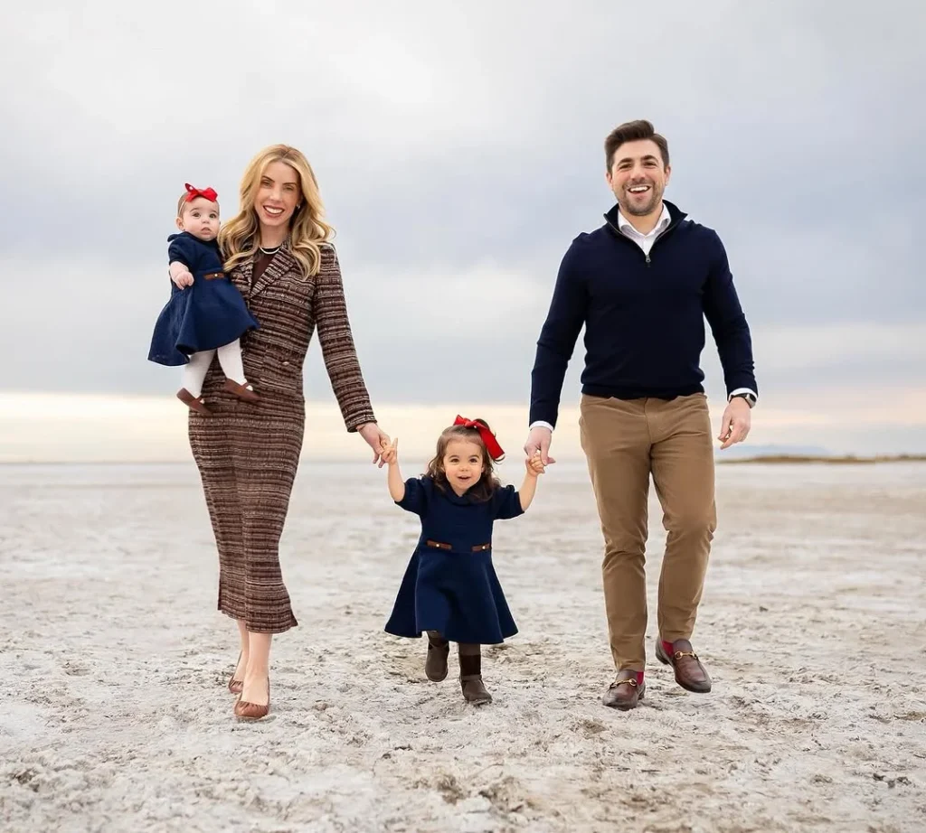 Soft winter light stretches across the open sky as this beautiful family walks hand in hand along the frosty shore. Their laughter carries in the cold air, blending with the peaceful rhythm of the waves. Coordinated tones of navy, brown, and cream create a timeless palette that stands out against the muted sand.